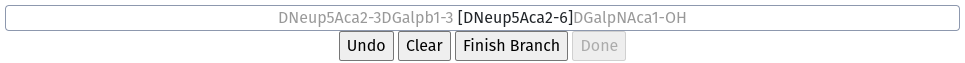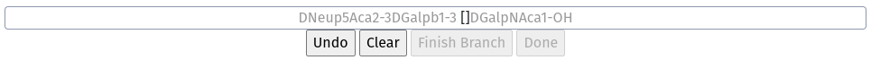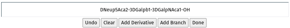 Once you have terminated your main chain with an aglycon, the Sequence box gives you a number of options. If your glycan is complete, merely click Done. Alternately, you can Add a Branch or Add a Derivative.