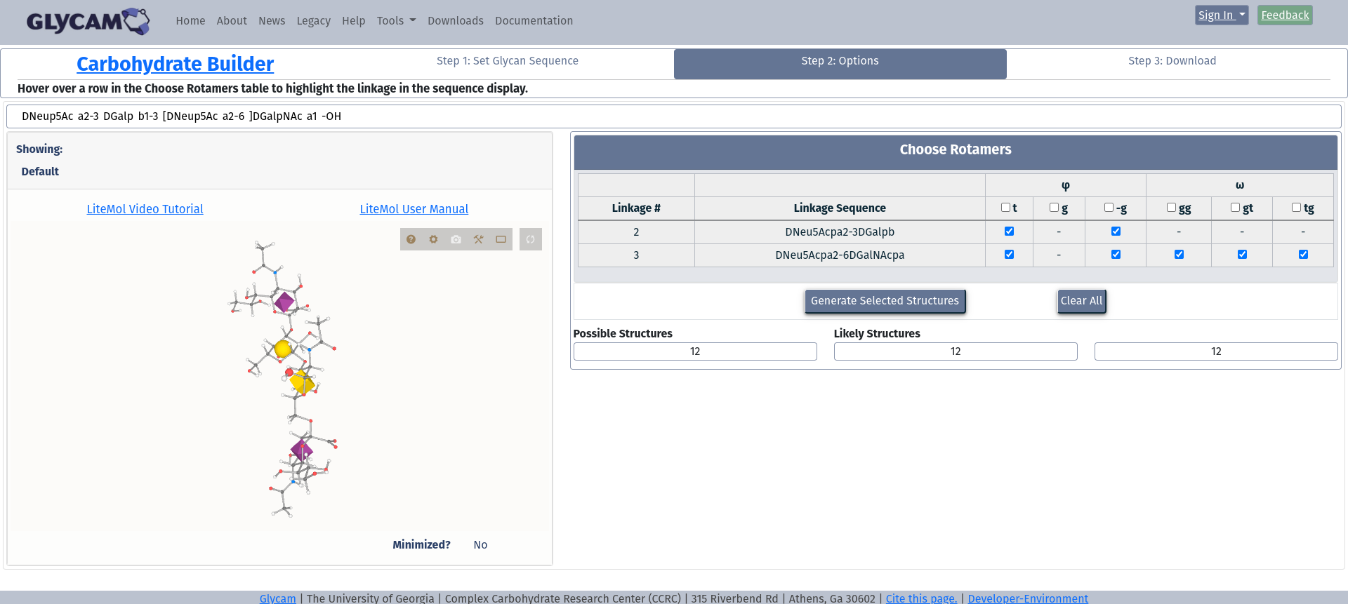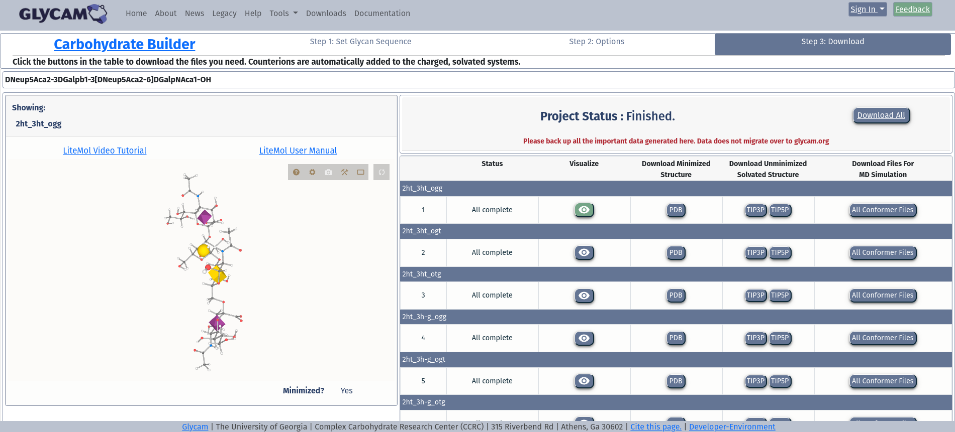After clicking Generate Selected Structures. you will be taken to a page where you can visualize and/or download structure files for your glycan.