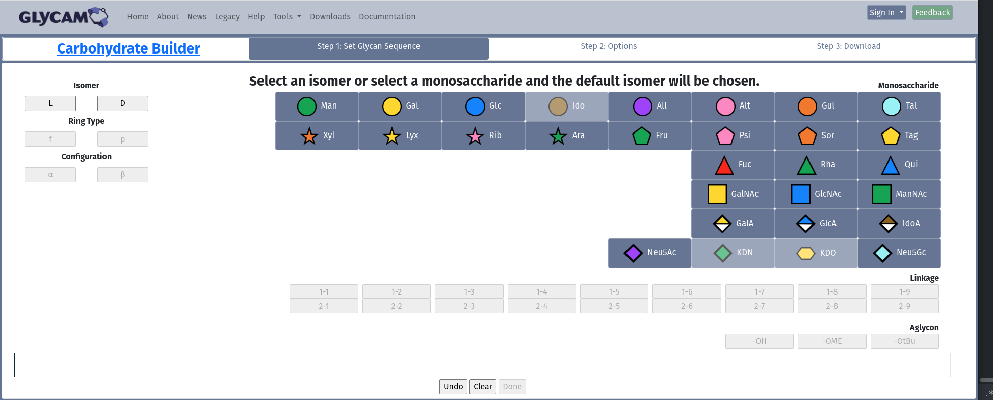 When you first arrive at the Carbohydrate Builder, this is what you will see. Note the portions of the page that are active: Isomer, and Monosaccharide. If you want to ensure the isomer (D or L) for your monosaccharide, then choose it in the Isomer box, Otherwise, just choose a monosaccharide, and the builder will choose the most common isomer for you.